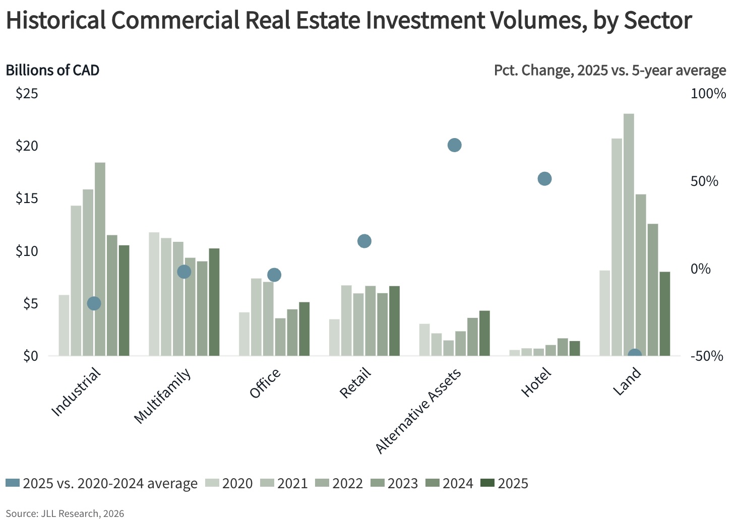 According to the Canadian Commercial Real Estate Outlook, 2026 recently released by JLL, the market is outperforming expectations following a year of transition. While total investment volumes finished 2025 at $46.2 billion—a 5% year-over-year decline and 29% below the 2022 peak—the report highlights a pivotal “return of institutional capital” as a defining storyline for the year.