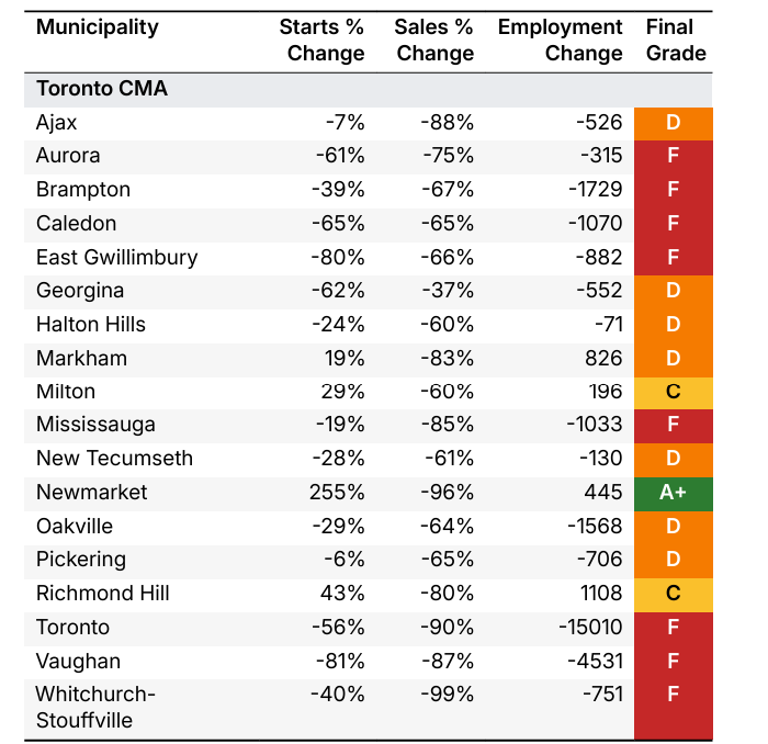 The new report also graded the municipalities in five categories related to housing starts and sales. Of the 34 municipalities, 17 received an F, nine received a D, and eight other municipalities received a C or higher. Toronto, Mississauga and Brampton all scored an F.